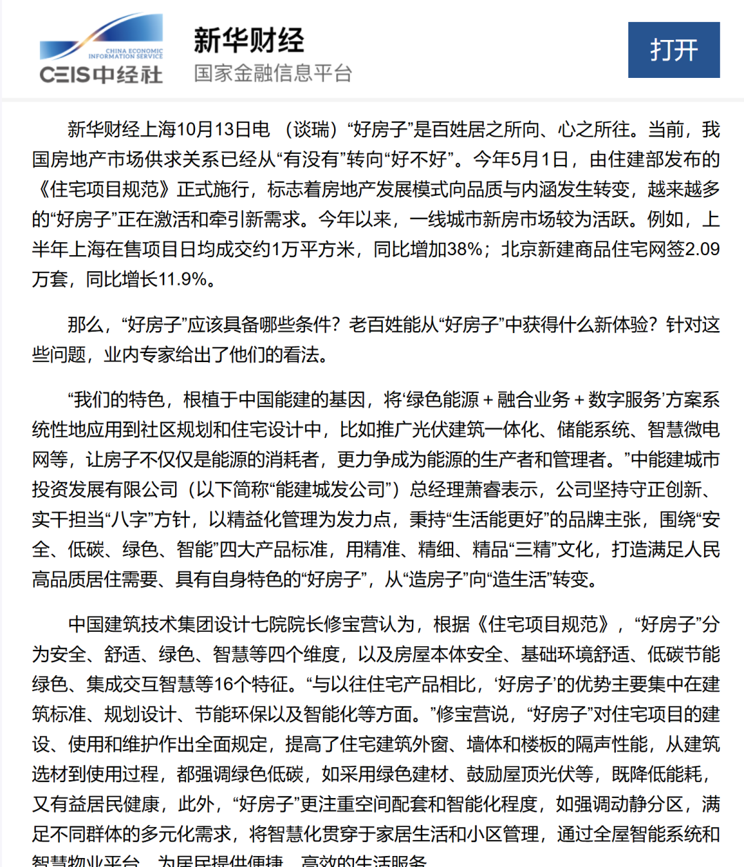 近日,“好房子”建設(shè)成為行業(yè)關(guān)注焦點(diǎn)——中國(guó)建技與中國(guó)能源建設(shè)股份有限公司(以下簡(jiǎn)稱“中國(guó)能建”)在“好房子”領(lǐng)域的探索與實(shí)踐,獲新華財(cái)經(jīng)、央廣網(wǎng)、國(guó)資委官網(wǎng)、《中國(guó)證券報(bào)》等主流媒體高頻報(bào)道。多層次、立體化的傳播矩陣不僅讓相關(guān)話題迅速破圈,單條報(bào)道最高閱讀量更突破130萬(wàn),充分彰顯兩家企業(yè)在“好房子”建設(shè)中的行業(yè)引領(lǐng)力,也印證了“好房子”理念與百姓宜居宜業(yè)需求的深度契合。