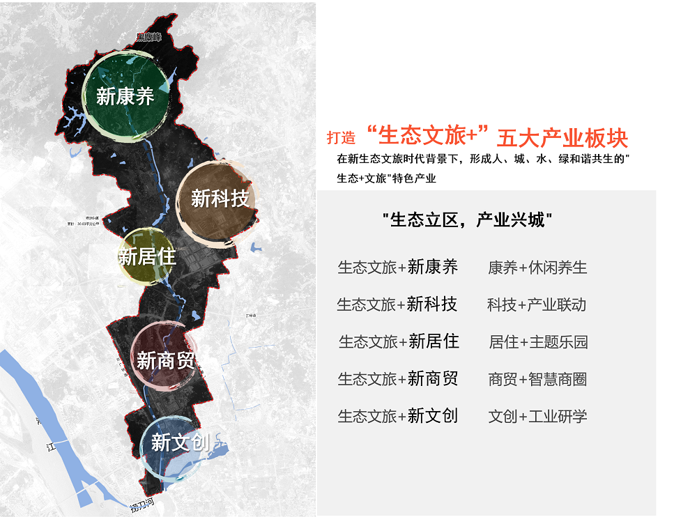 3.?產業(yè)布局策劃——在新生態(tài)文旅時代背景下,形成人、城、水、綠和諧共生的"生態(tài)+文旅"特色產業(yè),打造“生態(tài)文旅+” 五大產業(yè)板塊,即生態(tài)文旅+新康養(yǎng)、生態(tài)文旅+新科技、生態(tài)文旅+新居住、生態(tài)文旅+新商貿、生態(tài)文旅+新文創(chuàng)。