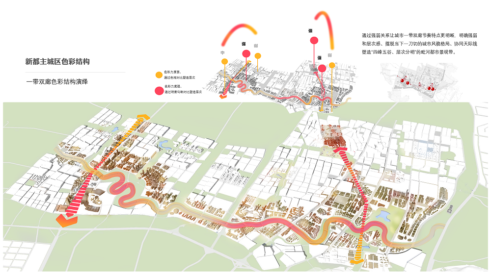 新都區(qū)城市容貌提升,是在公園城市建設背景下,追溯城市文脈、梳理城市色彩基底、尋找城市主調(diào),以城市色彩為核心,開展的系統(tǒng)性城市形象識別系統(tǒng)提升。創(chuàng)新執(zhí)行的城市色彩、戶外外擺、戶外廣告、戶外導視系統(tǒng),將城市以點、線、面的方式,全系統(tǒng)覆蓋,通過綜合性的治理體系及樣板段示范,建立可實施可落地的管控引導。