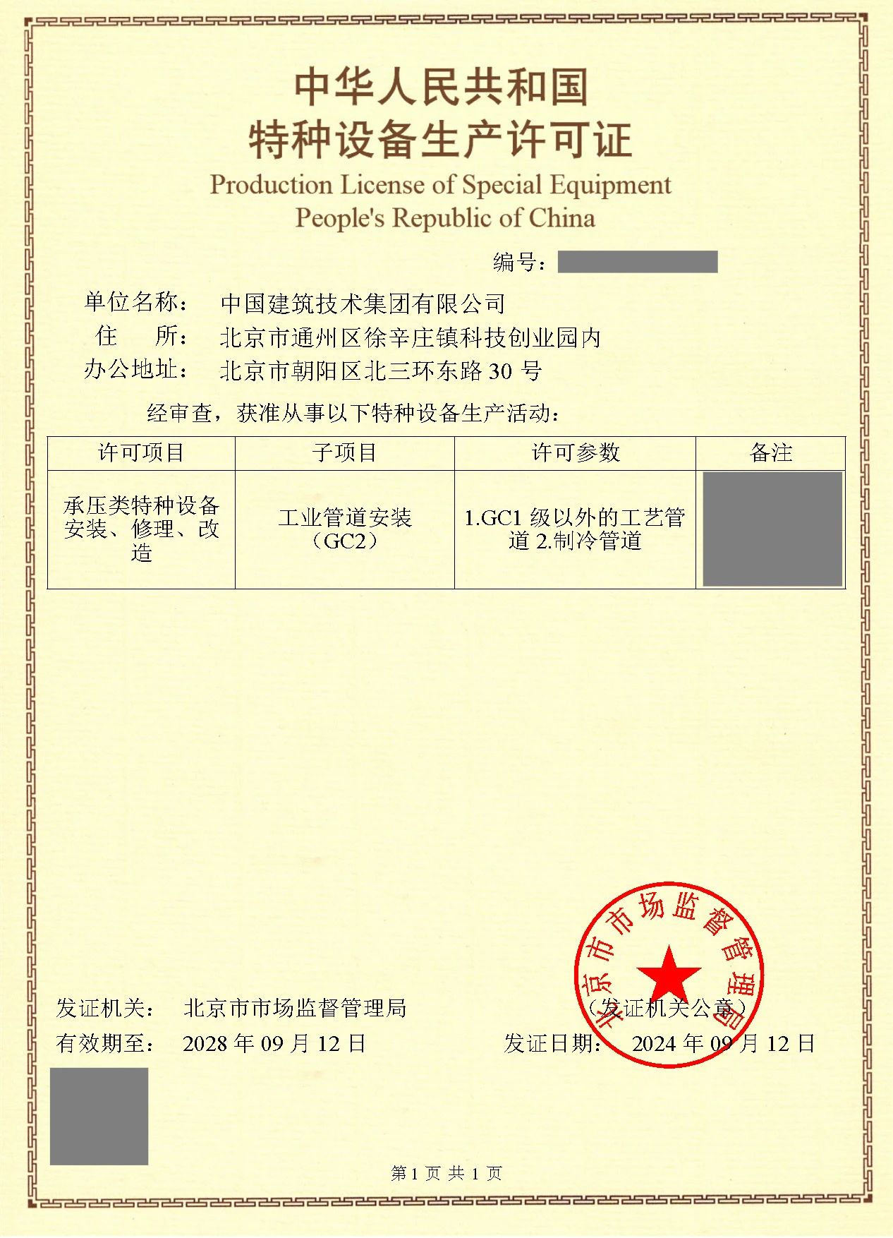 9月12日,經(jīng)北京市市場監(jiān)督管理局審核通過,中國建技成功取得“特種設備(GC2級工業(yè)管道安裝)生產(chǎn)許可證”。工業(yè)管道安裝(GC2級)生產(chǎn)許可證主要適用于承壓類特種設備的安裝、修理和改造。