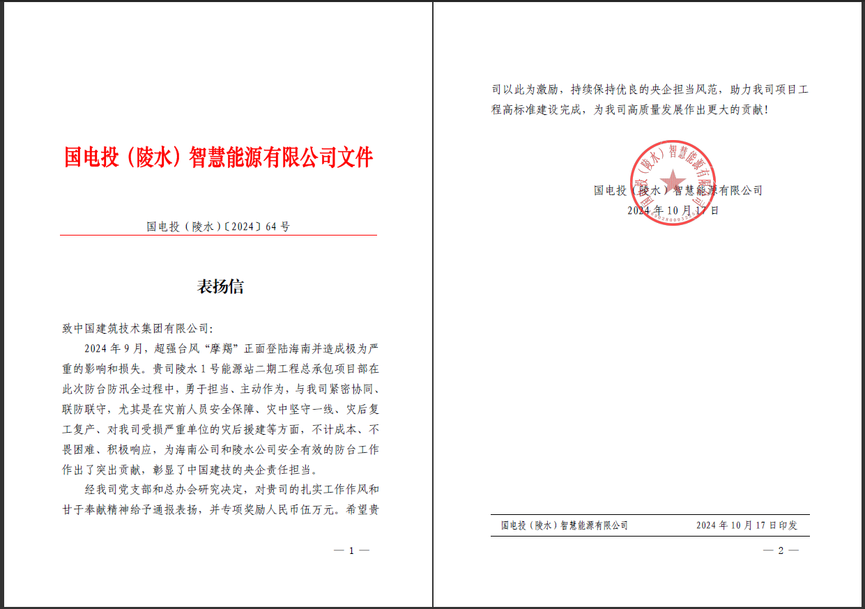 10月17日,中國建技收到國電投(陵水)智慧能源有限公司表揚信。對中國建技海南陵水1號能源站二期工程項目部在今年9月超強臺風“摩羯”登陸海南期間,為防臺工作作出的突出貢獻給予通報表揚。