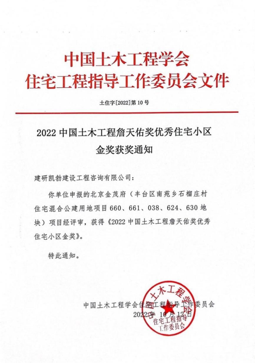 近日,中國(guó)土木工程學(xué)會(huì)住宅工程指導(dǎo)工作委員會(huì)公布了“2022中國(guó)土木工程詹天佑獎(jiǎng)優(yōu)秀住宅小區(qū)金獎(jiǎng)”評(píng)選結(jié)果,建研凱勃公司監(jiān)理的“北京金茂府(豐臺(tái)區(qū)南苑鄉(xiāng)石榴莊村住宅混合公建用地項(xiàng)目660、661、038、624、630地塊)”工程榮獲“2022中國(guó)土木工程詹天佑獎(jiǎng)優(yōu)秀住宅小區(qū)金獎(jiǎng)”。