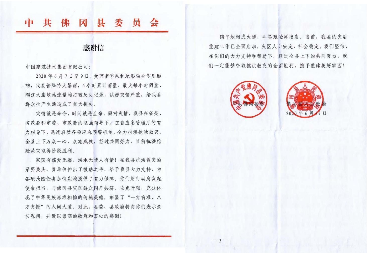6月17日、6月23日第六工程分公司清遠恒大御泉四季花園總承包項目部及第六工程分公司黨支部接連收到了清遠市中共佛岡縣委、佛岡縣人民政府、中共洛洞村總支部委員會的感謝信,感謝信內容主要是針對中技集團清遠恒大御泉四季花園總承包項目部及第六工程分公司黨支部在6月7日至6月9日清遠市佛岡縣發(fā)生的50年一遇的洪災中做出的巨大貢獻表示真誠的感謝。?