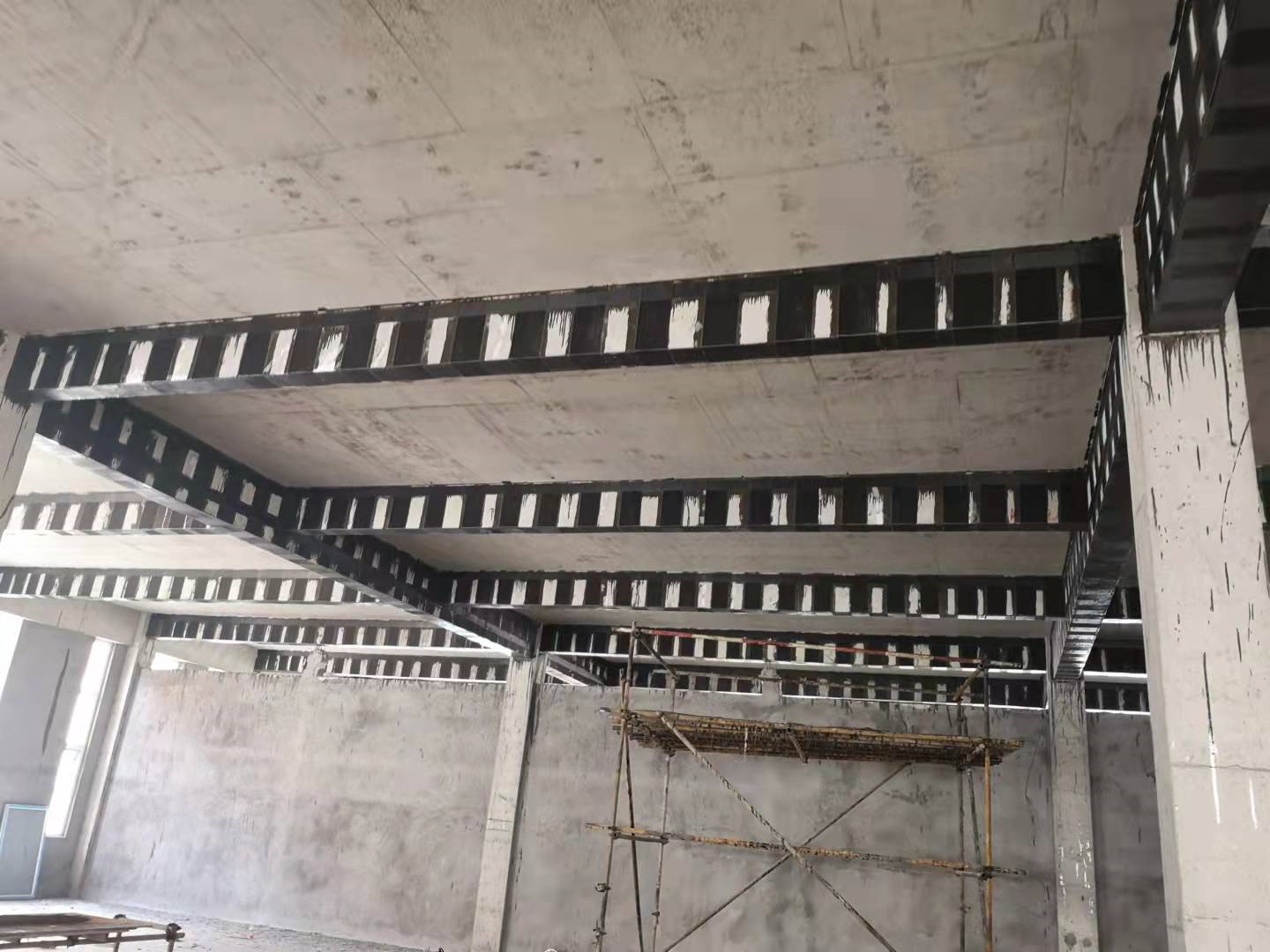 梁粘碳纖維或粘鋼:由于廠房急于交付使用,經設計優(yōu)化,在滿足原設計荷載的情況下采用施工迅速更便捷且占用空間最小的粘鋼和粘碳纖維工藝施工。節(jié)省了約1/4的工期