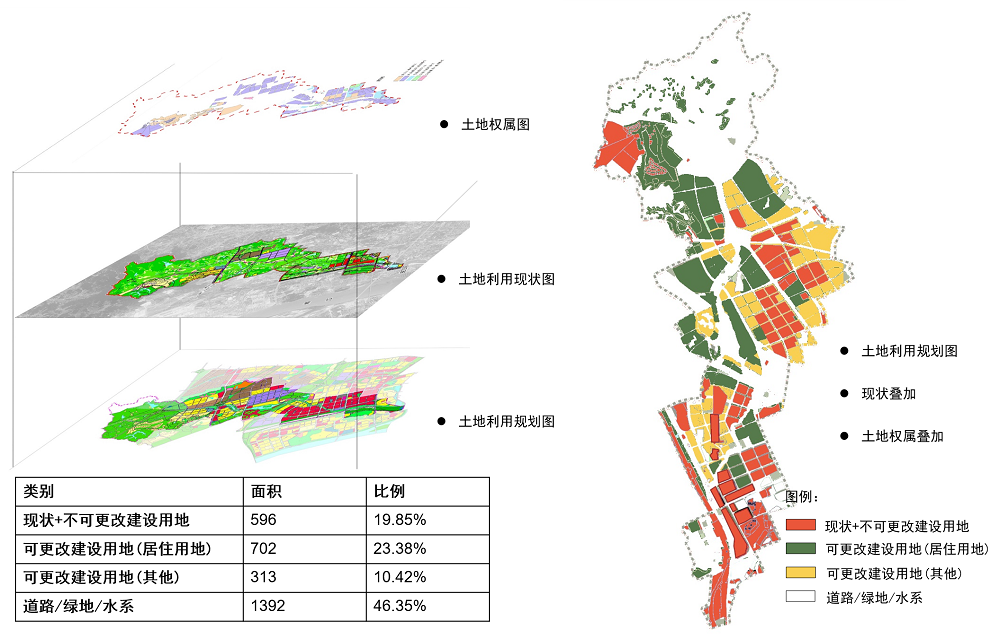 2.?土地情況梳理——對土地利用現(xiàn)狀情況、權屬情況、規(guī)劃情況進行三者疊加,結合產業(yè)發(fā)展方向及文化景點策劃,梳理水系及考慮產城配套,局部調整用地性質。