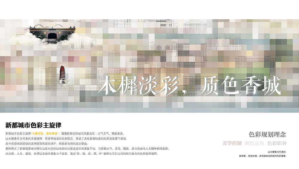 新都區(qū)城市容貌提升,是在公園城市建設背景下,追溯城市文脈、梳理城市色彩基底、尋找城市主調(diào),以城市色彩為核心,開展的系統(tǒng)性城市形象識別系統(tǒng)提升。創(chuàng)新執(zhí)行的城市色彩、戶外外擺、戶外廣告、戶外導視系統(tǒng),將城市以點、線、面的方式,全系統(tǒng)覆蓋,通過綜合性的治理體系及樣板段示范,建立可實施可落地的管控引導。