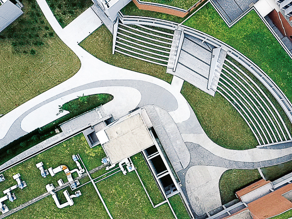 浦江源應(yīng)是如水一樣的校園,有分有聚,并具備很強(qiáng)的流動(dòng)性,故在規(guī)劃理念上,我們運(yùn)用流動(dòng)的景觀創(chuàng)造獨(dú)特而豐富的空間體驗(yàn),流動(dòng)的景觀同建筑完美的結(jié)合在一起,共同形成上戲浦江源。浦江校園內(nèi)具有大量的演藝空間,放映廳,排練廳,室外劇場(chǎng)等,這些空間賦予這座校園最強(qiáng)烈的性格——一個(gè)綜合的實(shí)訓(xùn)中心,我們考慮將這些空間設(shè)計(jì)成一個(gè)互相聯(lián)系的網(wǎng)絡(luò),這個(gè)系統(tǒng)具備便捷的流線連接,呼應(yīng)的視線連接,以及和室外景觀的結(jié)合,共同匯聚成浦江源。基于對(duì)所需建筑功能的分析,我們將建筑進(jìn)行了重新組合,將電視電影學(xué)院和圖文信息中心合并成一個(gè)學(xué)院綜合體,同實(shí)訓(xùn)中心相連。將體育運(yùn)動(dòng)中心、食堂與學(xué)生教工公寓合并形成師生的生活組團(tuán)。將行政樓、創(chuàng)意學(xué)院與基礎(chǔ)教學(xué)樓組合形成學(xué)校的教學(xué)實(shí)驗(yàn)區(qū)。